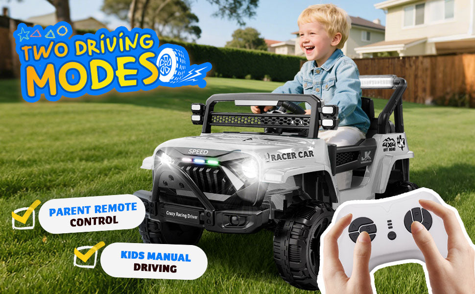 - 🎮【Dual Driving Modes for Kids】This versatile battery car caters to different age groups with two driving modes. Younger children can cruise at three adjustable speeds, controlled by parents using the remote, which includes an emergency brake for extra safety. Older kids can drive independently using the foot pedal, choosing between high and low speeds. It’s designed to be both entertaining and secure!