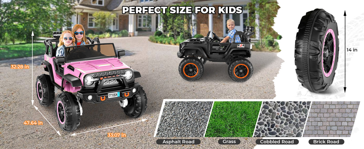 - [Best Gift Choice] Overall size: 47.6 L x 33 W x 32.2 H inches. Multi-function dashboard, USB/Bluetooth/MP3 music player, real pedal response and engine sound, dazzling color lights, give your child the most realistic driving experience. Perfect Christmas/Birthday Gift for Kids, Boys, and Girls!